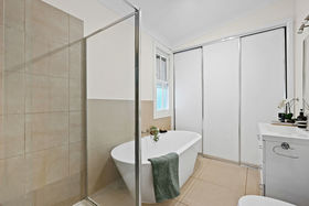 • Bathroom with deep feature tub, separate shower, & linen cupboard.