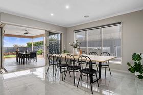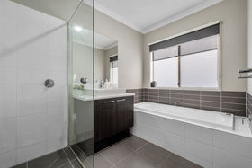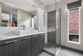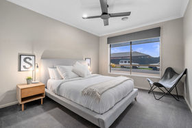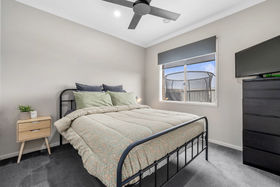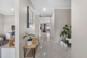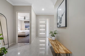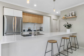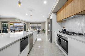 With a striking modern presence, the chef of home can cook in ease with stunning features such us 20mm stone waterfall benchtops to the island, upgraded sink, herringbone tiled splashback, dishwasher, 900mm appliances, feature pendant lighting, ample bench and cupboard and also seamlessly leads into your well positioned laundry.