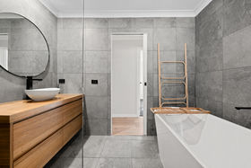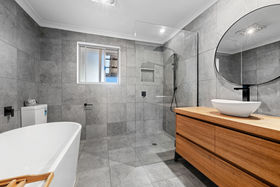 Accommodation includes three generous bedrooms, all with built-in robes. The master and second bedroom feature ceiling fans and split system heating and cooling. A luxurious central bathroom impresses with floor-to-ceiling tiles, frameless shower, and freestanding bathtub. A spacious laundry with ample storage completes the practical layout.